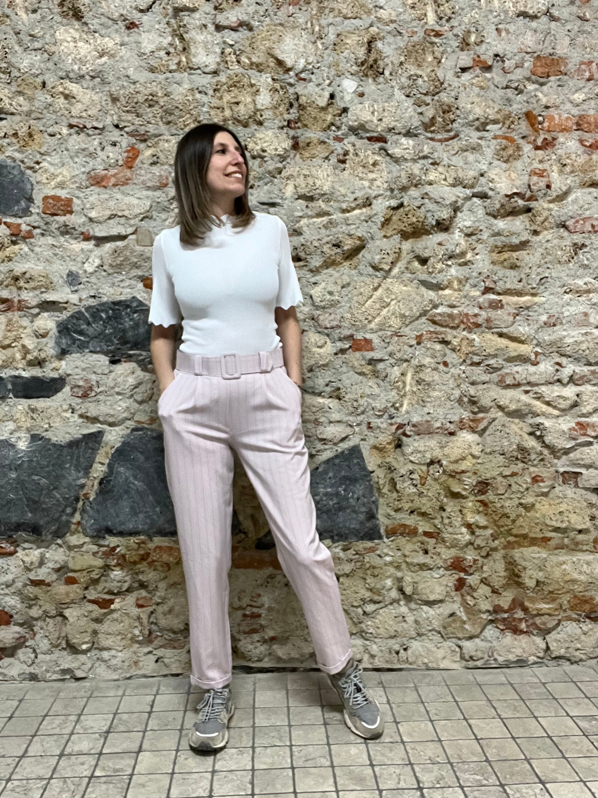 Pantalone a vita alta con una cintura integrata nello stesso tessuto, che aggiunge un tocco di eleganza e definisce la silhouette. Il taglio è dritto e leggermente morbido sulle gambe, offrendo comfort e uno stile rilassato ma sofisticato. Il tessuto presenta una fantasia a righe sottili verticali in tonalità neutre, che slancia la figura e lo rende versatile per diversi look. Il risvolto sull'orlo dona un dettaglio casual-chic, mentre le tasche laterali aggiungono praticità. Perfetto da abbinare sia con sneakers, per un look più sportivo, sia con scarpe eleganti per un outfit da ufficio o per occasioni più formali.